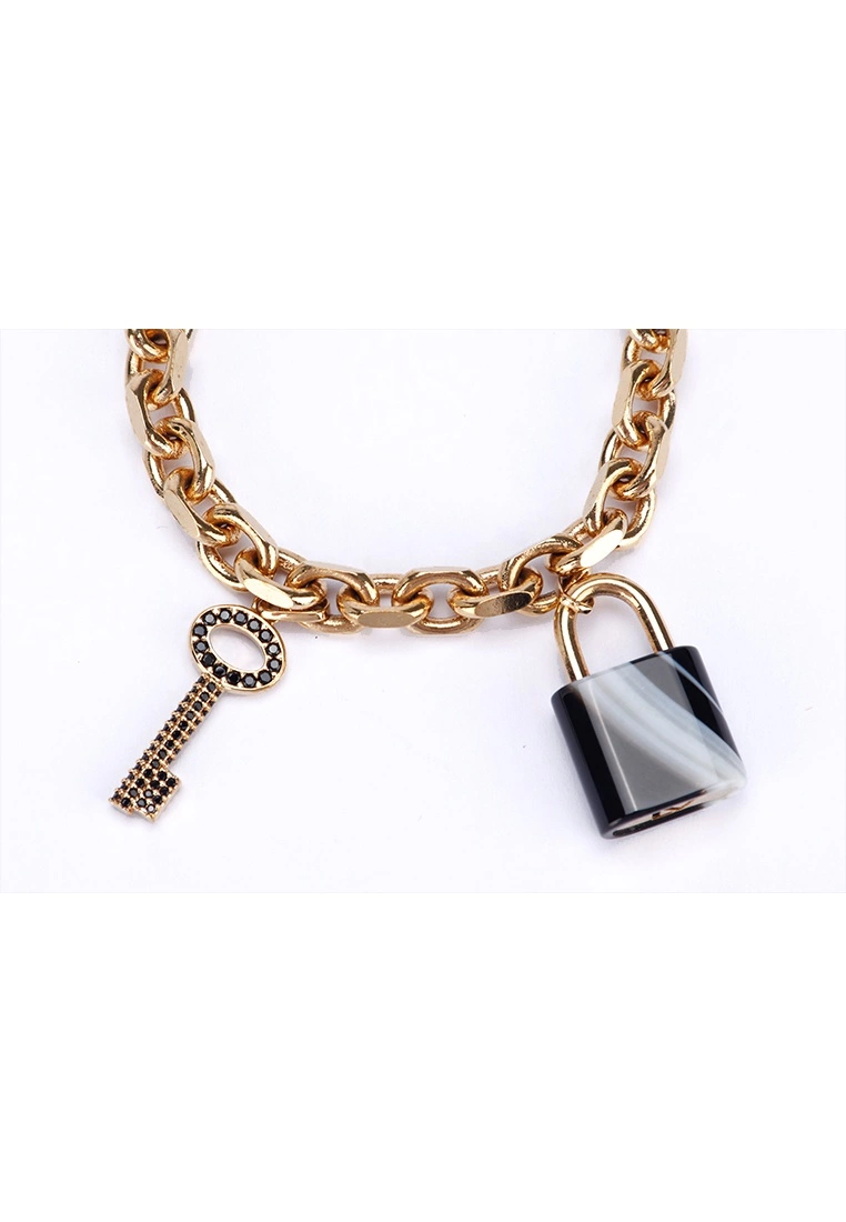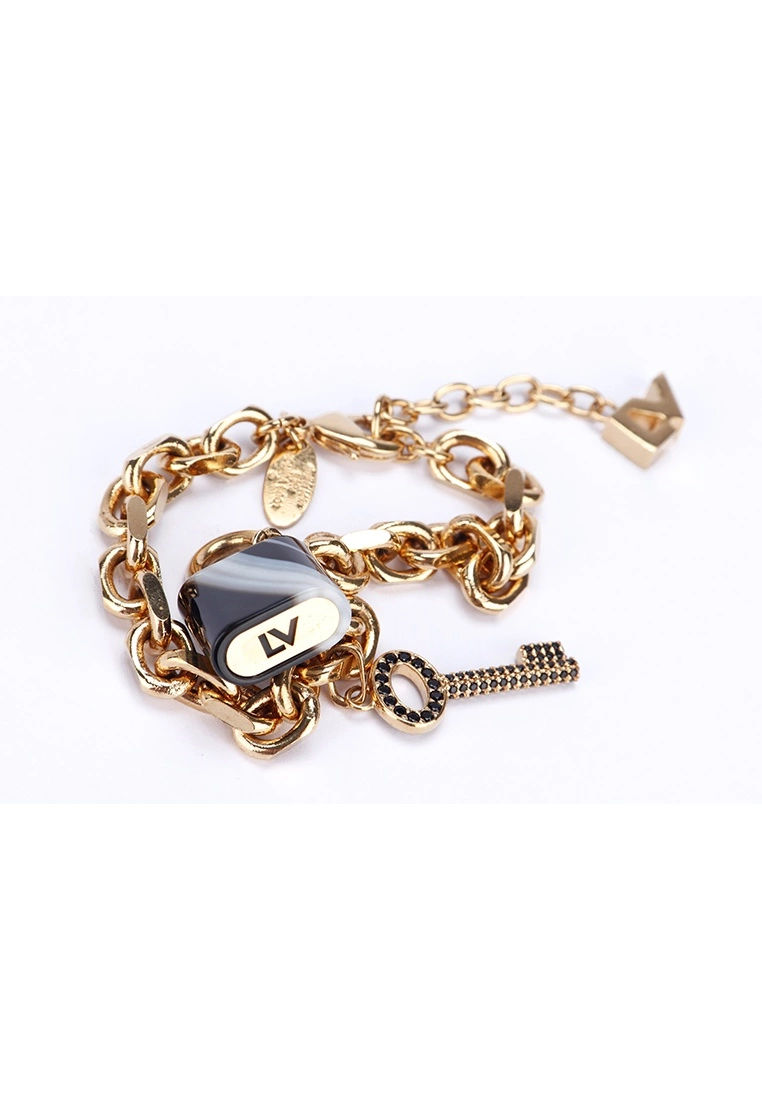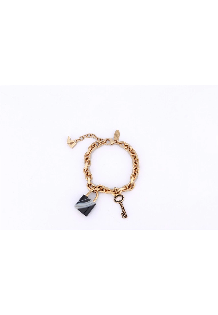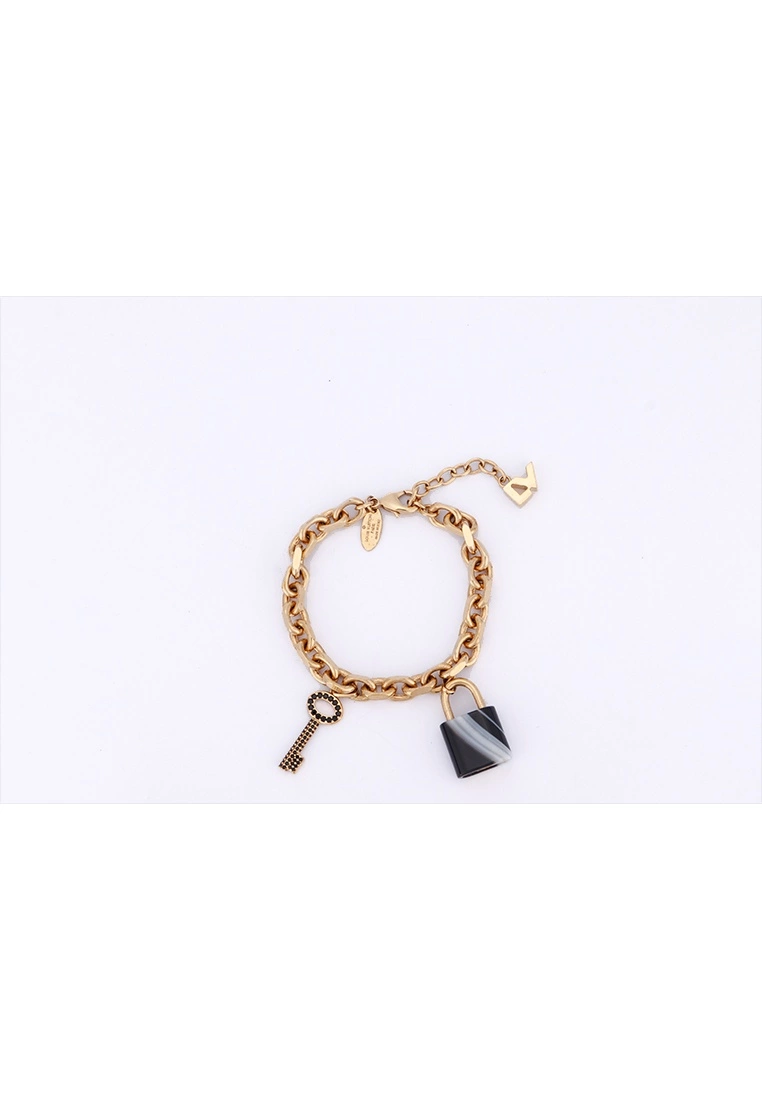 This Louis Vuitton Enamel Lock & Key Charm Bracelet is stylish gold tone chain link bracelet features a lock charm and LV logo pendant. The lock and key features in black and gold color. This is a beautiful bracelet for a one of a kind look. This item is in decent condition. Does not comes with original dust cover. The pictures show exactly the items you will get.