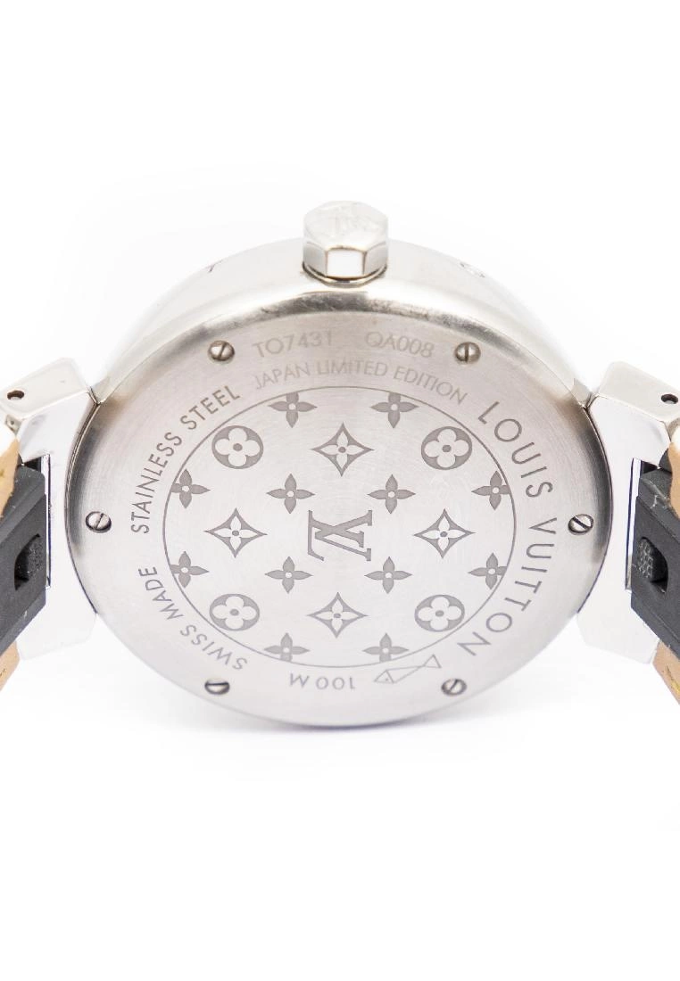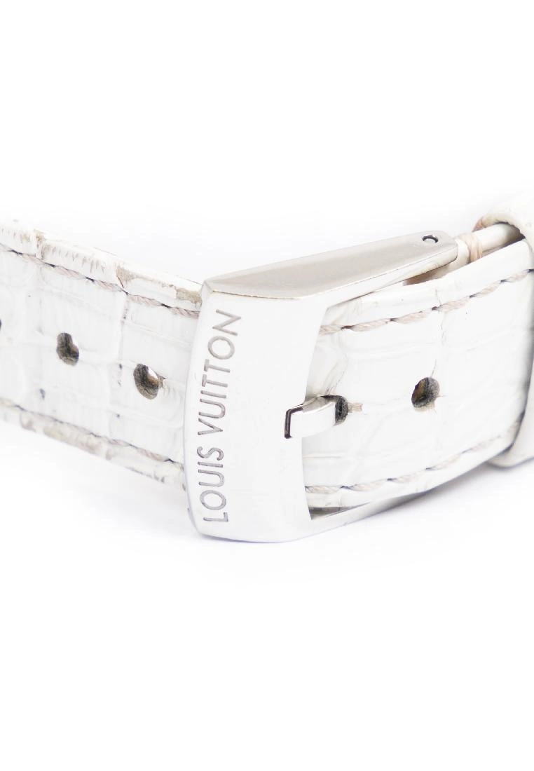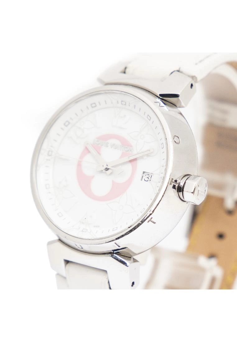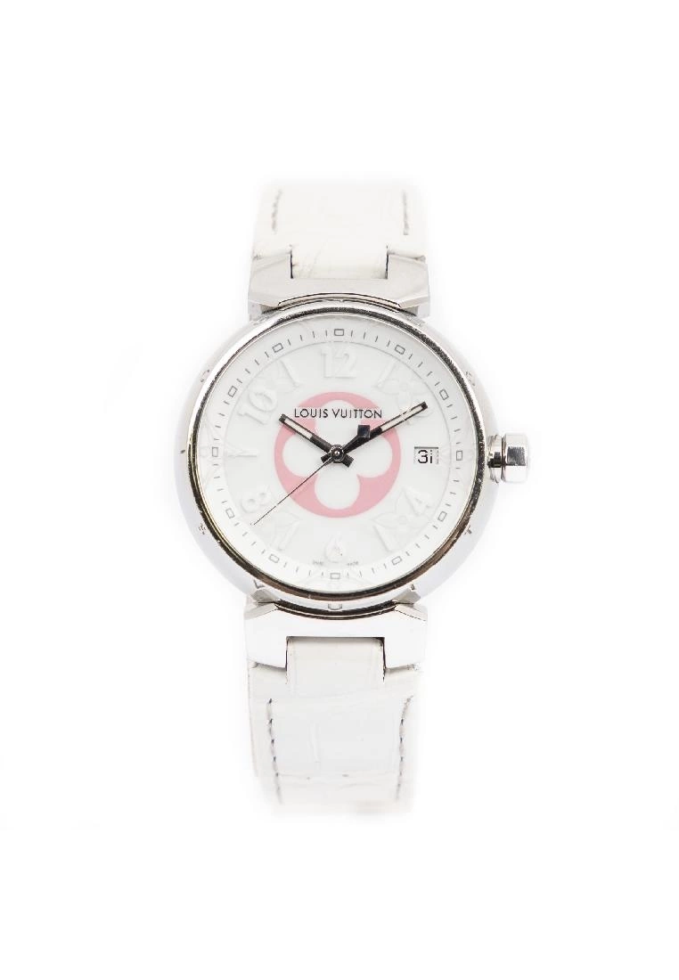 Louis Vuitton Watch Tambour Slim Color Blossom 100M in Silver/White/Pink Silver Plated and White Dial hardware. The grade condition of the product is: A which means the product is in Excellent Condition . Dimension: Bracelet: 21cm, Dial: 3*3cm. SKU: AAU2478. Notes: slight scuff on leather, Faint scratches on hardware